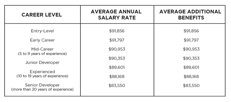 According to Indeed.com, the average annual salary of the developer is $94,599. It means a professional can make up to $52.69 per hour. Additional benefits come in the form of stock options, which are satisfactory to 72% of reported ratings. The data is based on 3,400 salary reports on the site.